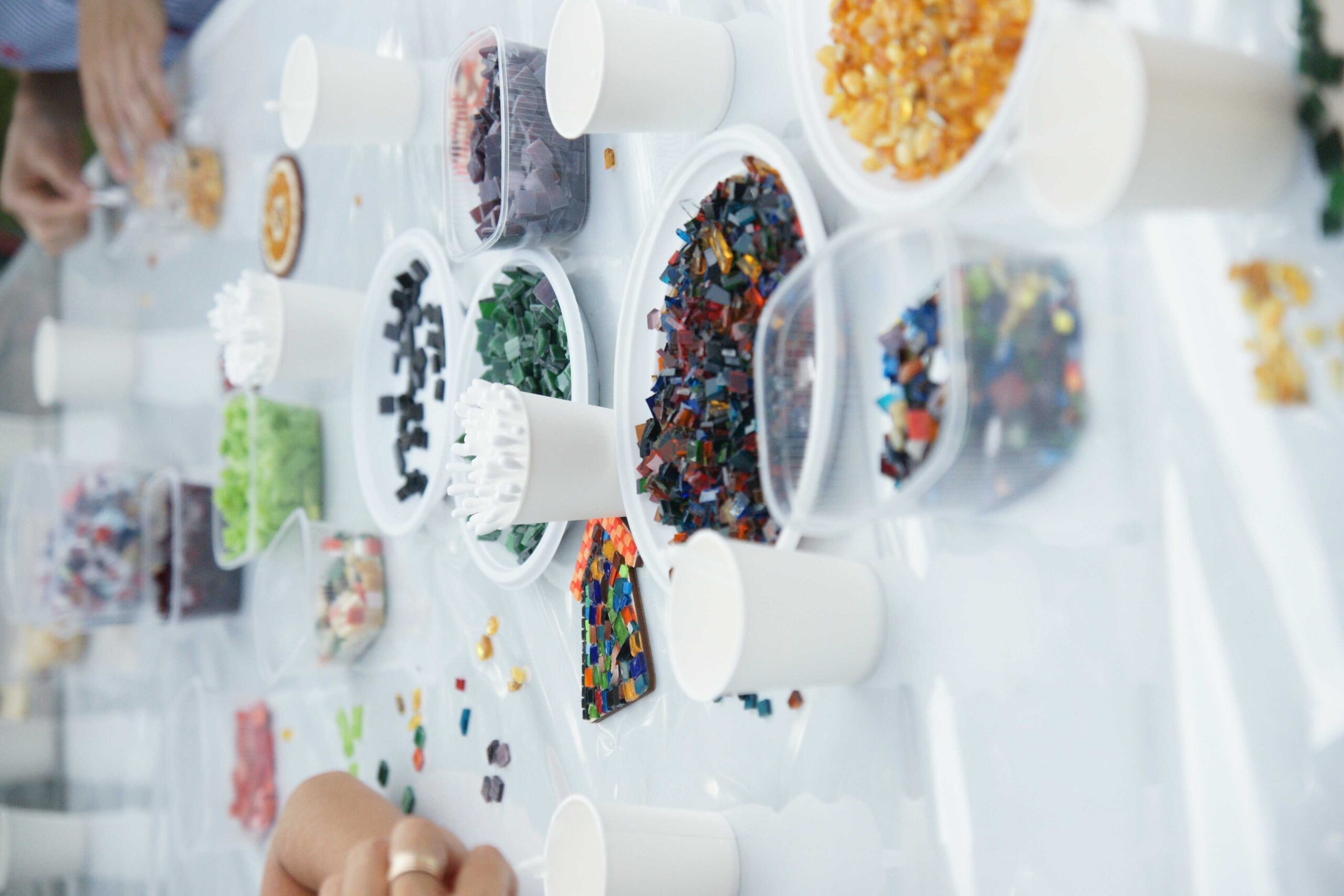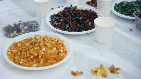 Для сбора мозаики на мастер-классе на столах были выставлены небольшие контейнеры с различными материалами – янтарём и стеклом самых разных цветов. Также предоставлялись дощечки для выкладки и закрепления придуманного узора. Работа каждого участника была уникальна и ярко играла всеми красками в лучах полуденного солнца. Такой сувенир долговечен и станет украшением в любом доме.