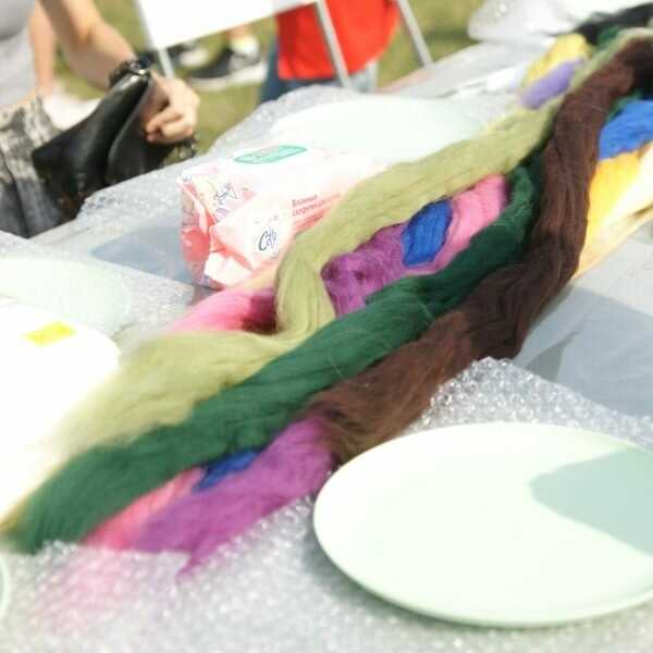За одним из столов желающие могли свалять себе на память мини-валенок из окрашенной шерсти и даже украсить его, вставляя в основу нити пряжи другого цвета. Вместе с этим можно было узнать о том, какую роль играли валенки в традициях народов Евразии, когда они появились на территории Руси и почему получили широкое распространение только в конце XIX века. Ещё один интересный факт о валенках – это способы «валяния» и даже «катания» шерсти, которые применялись в кустарном производстве. Для того, кто не знает таких тонкостей, могло показаться, что сделать валенок своими руками сложно и долго, но поскольку на мастер-классе речь шла о сувенирах, то можно было убедиться, что сделать небольшую валяную фигурку достаточно просто и занимательно. Что интересно: именно за этим столом было больше всего взрослых и даже пожилых людей, знающих не понаслышке об уникальности и удобстве этого вида зимней обуви.