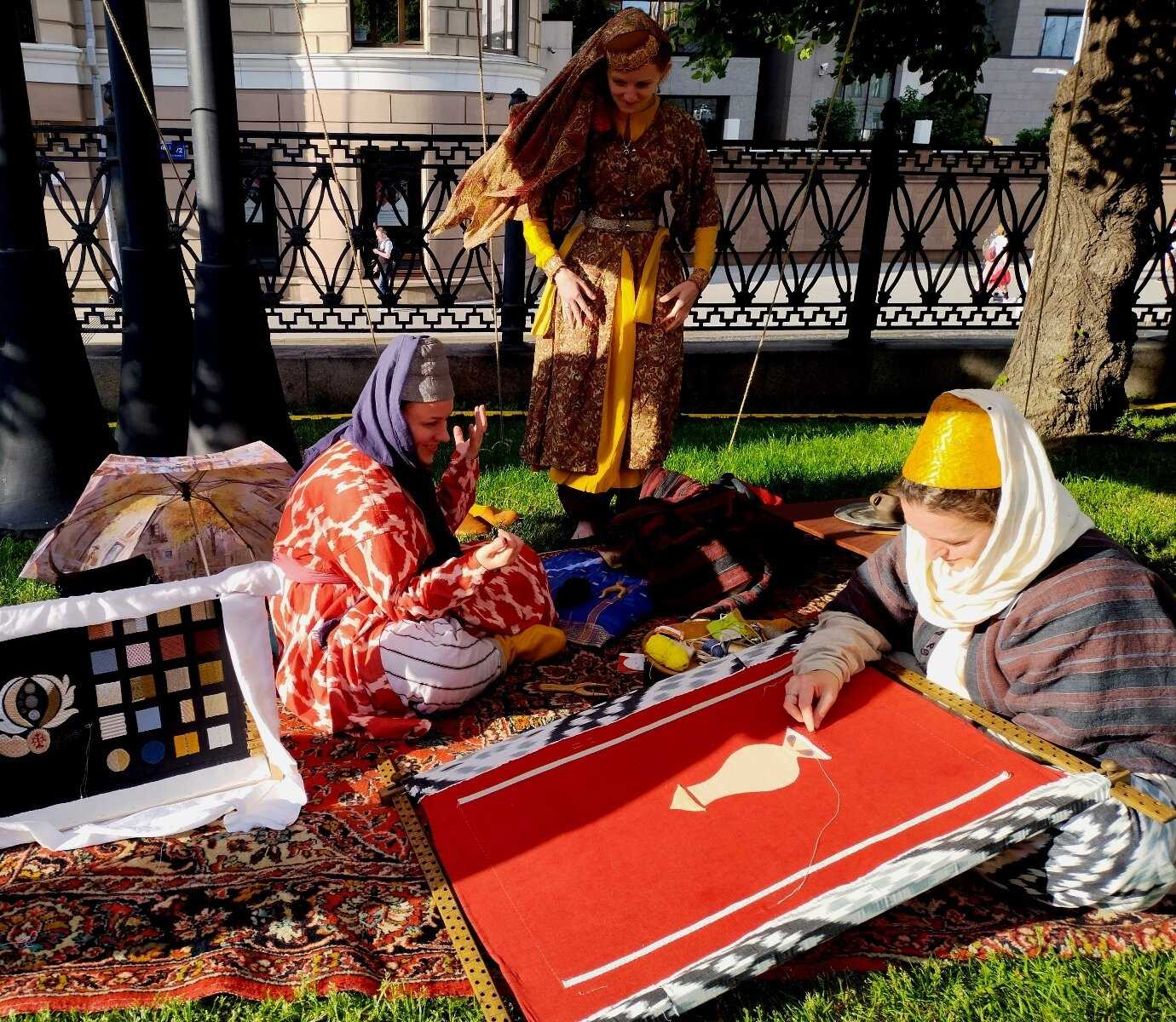 Две рукодельницы, сидя на роскошном ковре, демонстрировали свое мастерство. На красную ткань, натянутую на раму, аккуратными стежками нашивалась контрастная белая аппликация (то ли кувшин, то ли нечто очень похожее).