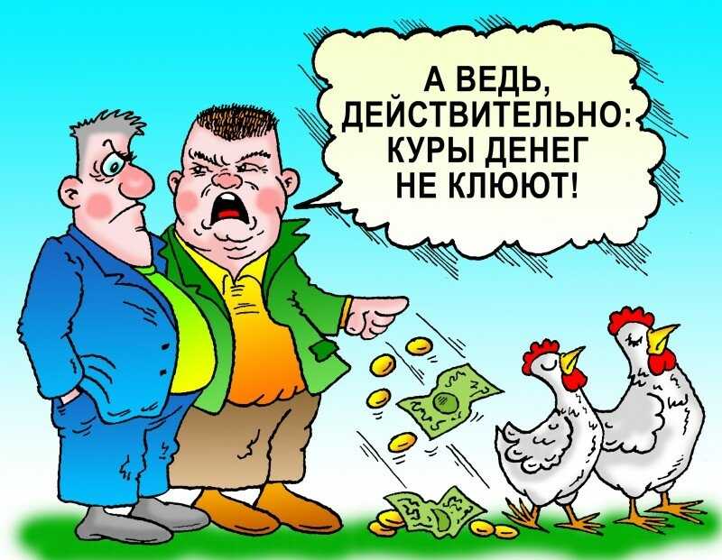А вот откуда пошло? Есть такая несколько шутливая, но очень распространенная версия. Схимник Лазарь Боголюбский в одном из своих трактатов, написанном в 1503 году, рассказывает такую историю. В одном селе жили богатые купцы. Однажды, когда дворня сгружала с телеги мешки с золотом, один из них развязался и монеты высыпались на землю. Стоявшая неподалеку девка-курятница от неожиданности выронила мешок с зерном. Куры набросились на него, мешая слугам собирать монеты. Тут из дома выбежала старая хозяйка и стала кричать: «Деньги склюют!» Когда все улеглось, женщина приказала зарезать всех кур и проверить, есть ли у них в животах монеты. Хозяин попытался ее переубедить, но потом плюнул и дал добро. Спустя час, купец тряс потрохами перед носом жены и кричал: «Ну что, убедилась? Денег куры не клюют!» Так и пошло гулять выражение.