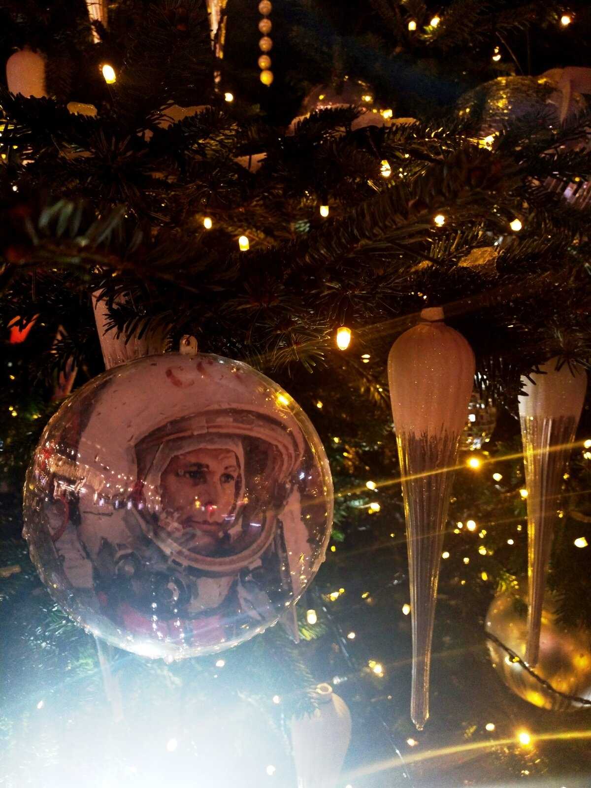 Далее глазам посетителей площадки фестиваля «Путешествие в Рождество» представала елка «Космос» от Ларисы Каменской (Kamenskaya). «Первое образование я получила в аэрокосмическом университете, поэтому и тема космоса мне очень близка. Россия была и остается лидером в области освоения и исследования космоса во многих аспектах. Кроме обычных игрушек-ракет мне захотелось добавить в оформление елки фотографии реальных людей — ученых и космонавтов. Ель декорирована кремлевскими звездами, гирляндами из флажков с фотографиями космонавтов и ученых-разработчиков, ну и конечно, игрушками: шарами, ракетами, спутниками.