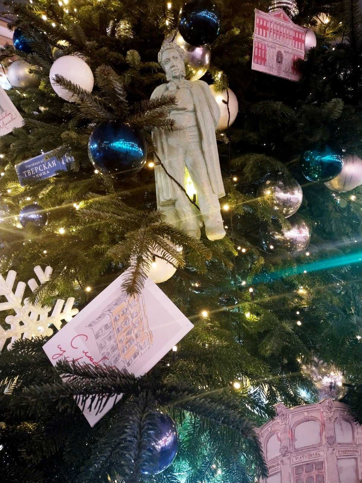 «Прогулку по Тверской» предложили посетителям площадки Юлия Статенко и Лидия Хубулова. «Тверская — главная магистраль столицы с уникальной архитектурой. Особняки 19 века, соседствующие с домами в стиле сталинского ампира и современными стеклянными зданиями, демонстрируют, как менялся облик столицы сквозь столетия. Каждый фасад на Тверской улице уникален и достоин внимательного взгляда и пристального изучения. Именно Тверская, которую называют самой парадной и торжественной улицей Москвы, вдохновила меня на создание новогодней ели. Ее украшают игрушки, олицетворяющие самые яркие и значимые места Тверской. А венчает новогоднюю елку красная кремлевская звезда».